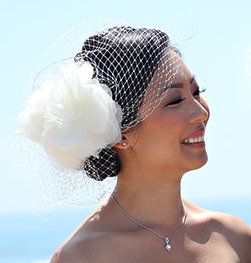 My BFF, also know as Mrs. Hot Wings on weddingbee.com, made a birdcage veil and a large flower fascinator for her San Diego Wedding. (Craftiness brought us together 😉 )
