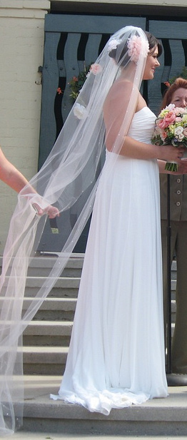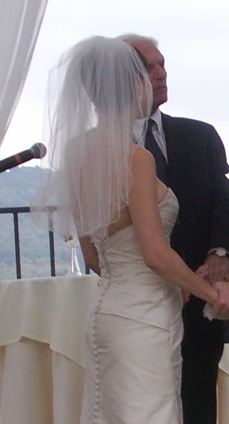 Mrs. Hot Wings also made Mrs. Pashmina’s cathedral veil for her Catalina Island wedding with bling glued along the edge. It blew delicately in the island wind.