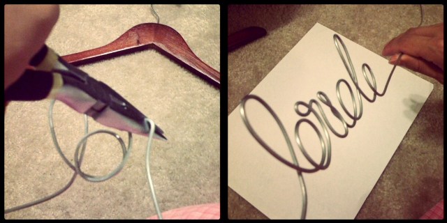 Cut a piece of wire, accounting for 8-10 inches per letter plus 10-12 inches for the spacing—better to have more than not enough wire (I used 50 inches for “bride”). I looked at Etsy for ideas on how to form the letters. I mostly used my hands to shape the curvy letters and pliers to hold and bend tighter letters, like the “r” and “i”. The “i” was definitely the most difficult.