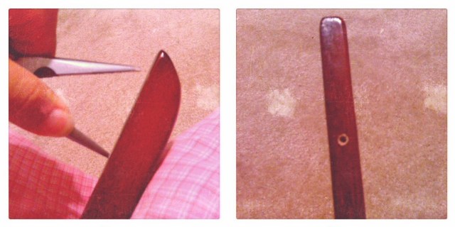 Using the needle nose, poke holes in the hanger for where the wire will be glued. I placed holes about 2 inches from each end, 1/4 inch deep. If you have a drill, it will make this step a lot easier.