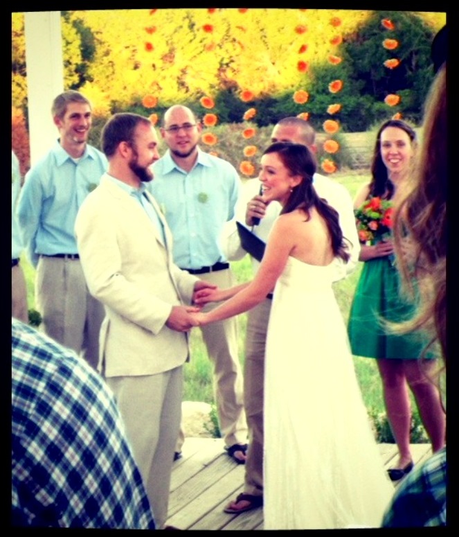 The wedding took place during the annual HarFest at a friend’s ranch out in McDade, TX. Entertainment included bands jamming out, C-Man DJing, a bouncy house for the kids, and open mic toasts, incited by C-Man of course. People really brought their A-game with the potluck food. Our friend, Carly, even made the amazing wedding carrot cake. There were kegs of beer, boxed wine, and home-brewed beer, mead, and cider. We camped out after the reception.