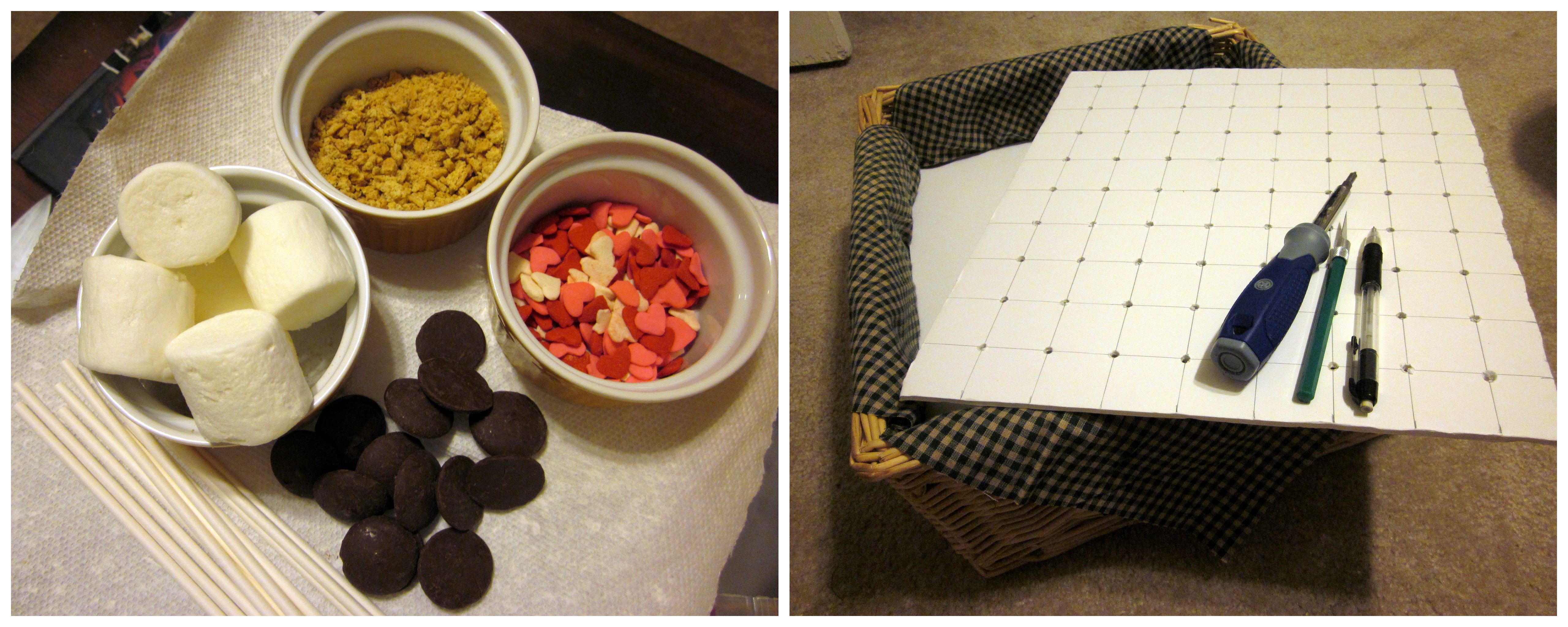 - Optional: display box (I cut two pieces of foam posterboard to size, marked off 1.5 inch squares, punched out the holes on both sides of one foam piece using a screwdriver, and placed it in a basket draped with fabric)