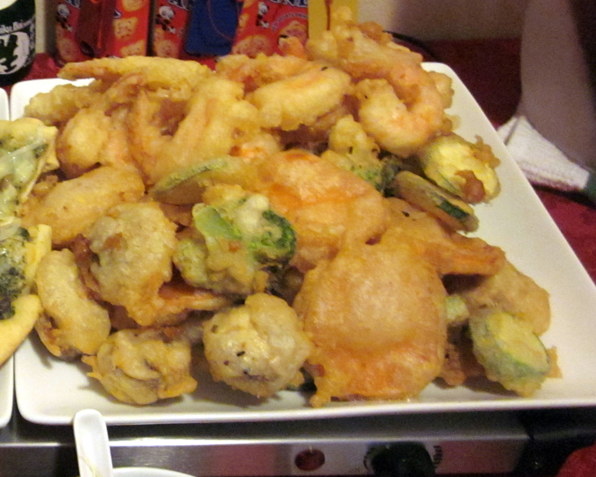 3. Mixed Tempura – I used slices of one small zucchini, florets from half a broccoli head, slices of one small sweet potato, half a box of white mushrooms, and 30 large shrimp with three slits in the inner curve for the tempura. The batter was from a 10 oz box of Kikkoman tempura batter mix and a bottle of Kirin beer.