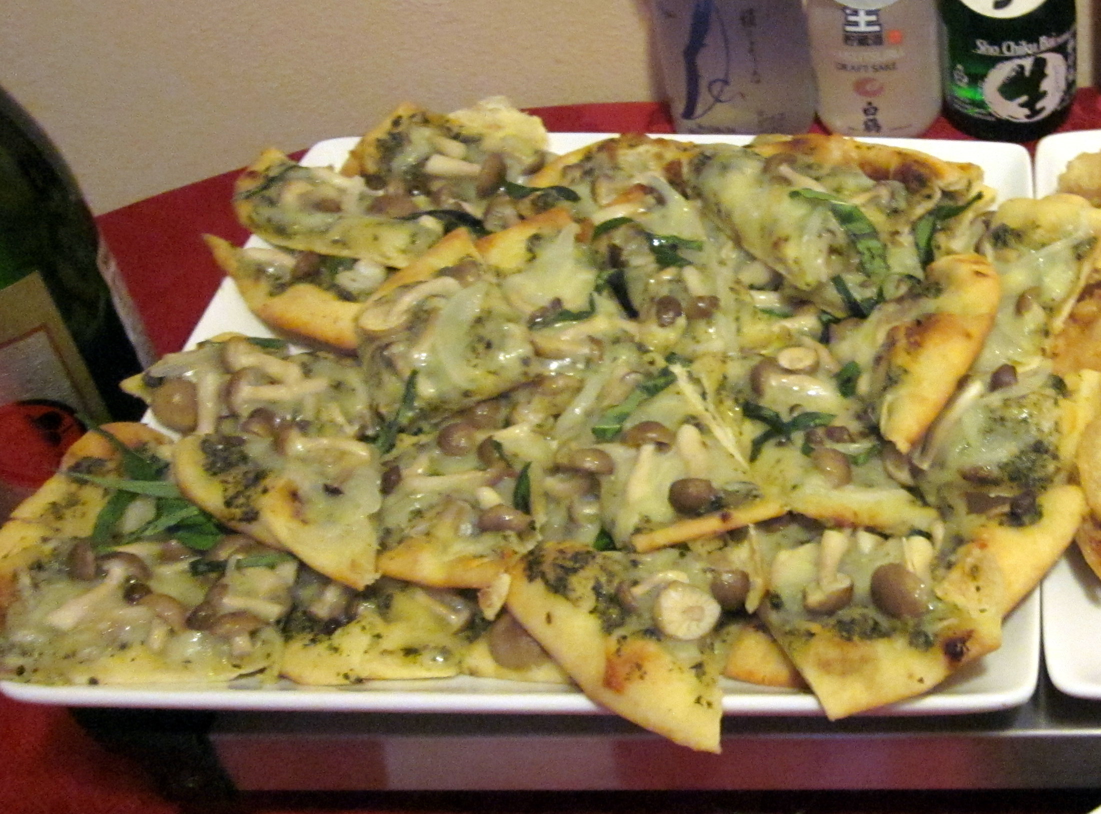 2. Japanese Mushroom Flatbread from Steamy Kitchen. I made four of these using one 7 oz container of basil pesto sauce, three bundles of Japanese brown beech mushrooms, and one bag of shredded mozzarella cheese.
