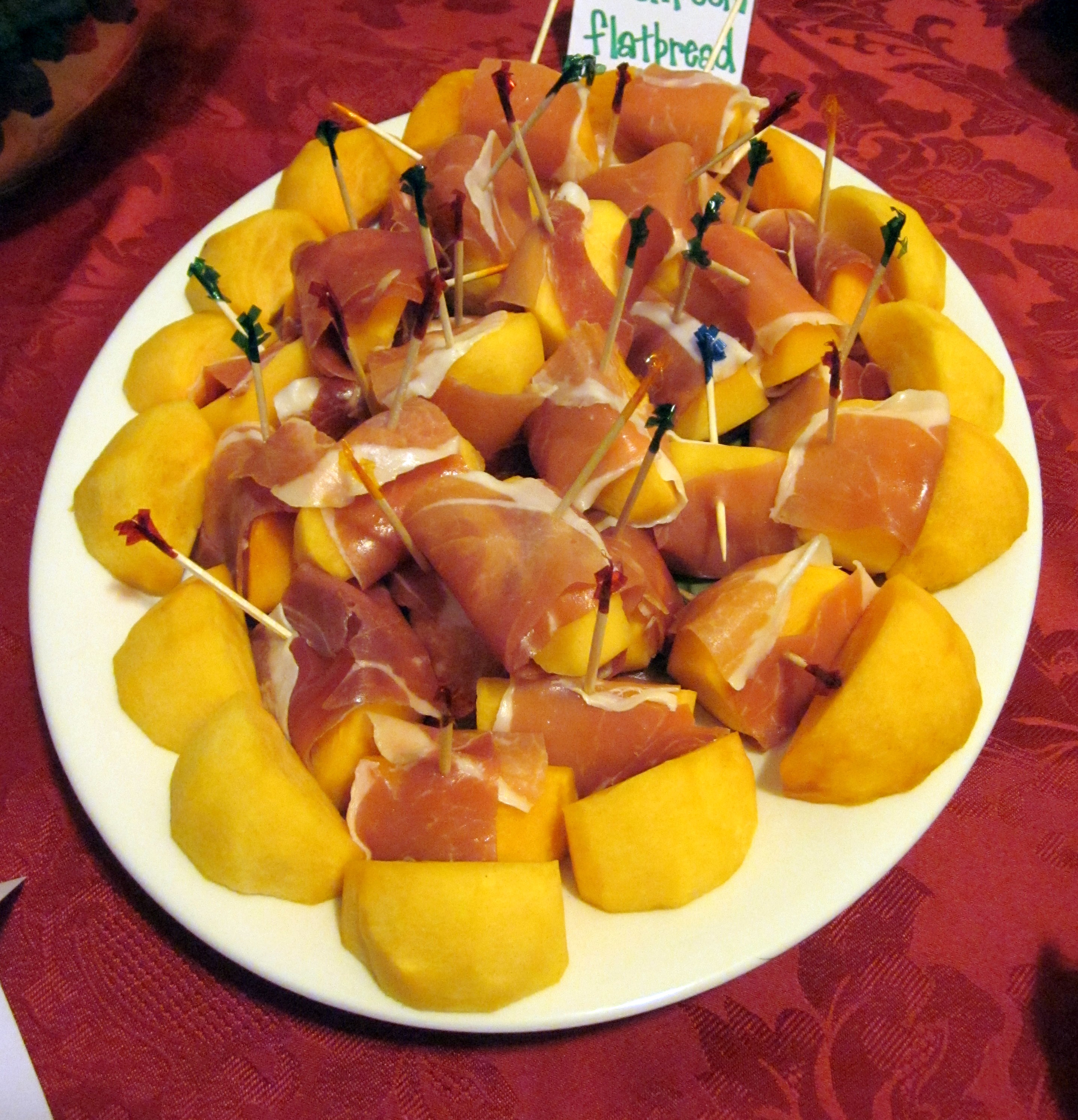 4. Proscuitto-wrapped Persimmon – Martha Stewart had previously featured persimmons wrapped with duck proscuitto. I couldn’t find duck proscuitto at my local market plus it sounded expensive. My mom sent me persimmons from her backyard in California. I peeled, cored, and cut each persimmon into eighths. I switched off cutting each proscuitto slice into halves and quarters, then wrapped a piece around the persimmon. A yummy fall alternative to proscuitto-wrapped cantaloupe.