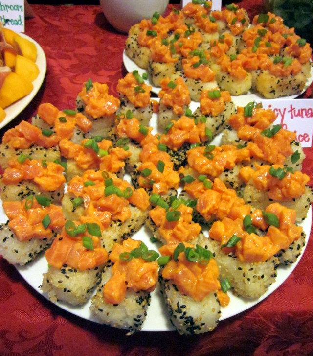 1. Spicy Tuna with Crispy Rice from The Ravenous Couple – I used six cups uncooked rice which made about 10 cups of cooked rice to form 50 pieces. I went light on the sushi-su (seasoned vinegar) using about 1 cup, but use as much as you prefer, although it doesn’t matter too much since you fry the rice. Also, 1.25 lbs of sushi-grade tuna from Asahi Imports was more than enough to cover 50 rice cuboids.