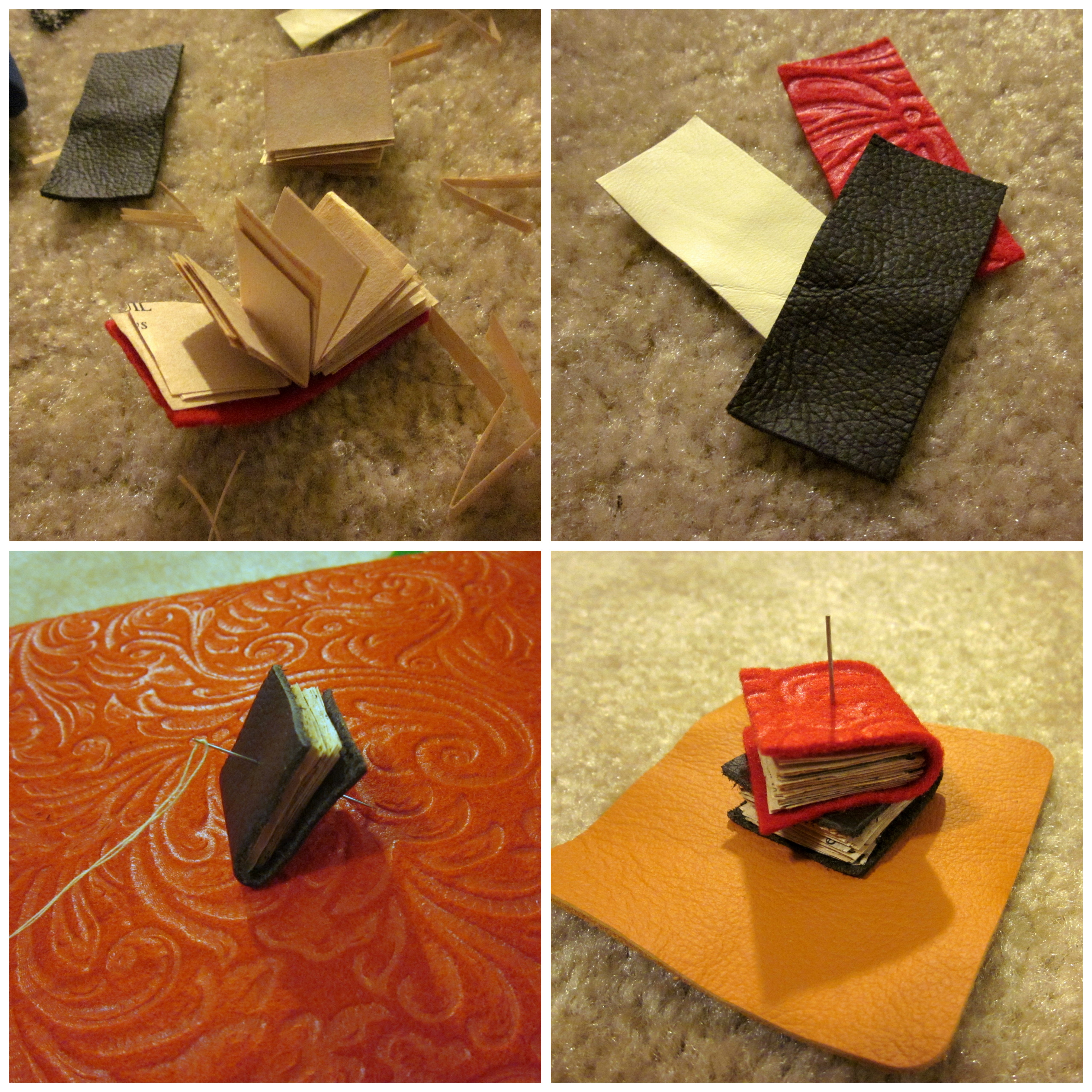 Cut out 0.75 x 0.75 inch pages from the book. Try to use pages with little text. Then cut the leather/felt book cover to 1 x 2.25 inches or size it to a stack of pages (I cut the leather first and ended up having to trim all my paper to make it fit inside the book cover 😦 ).