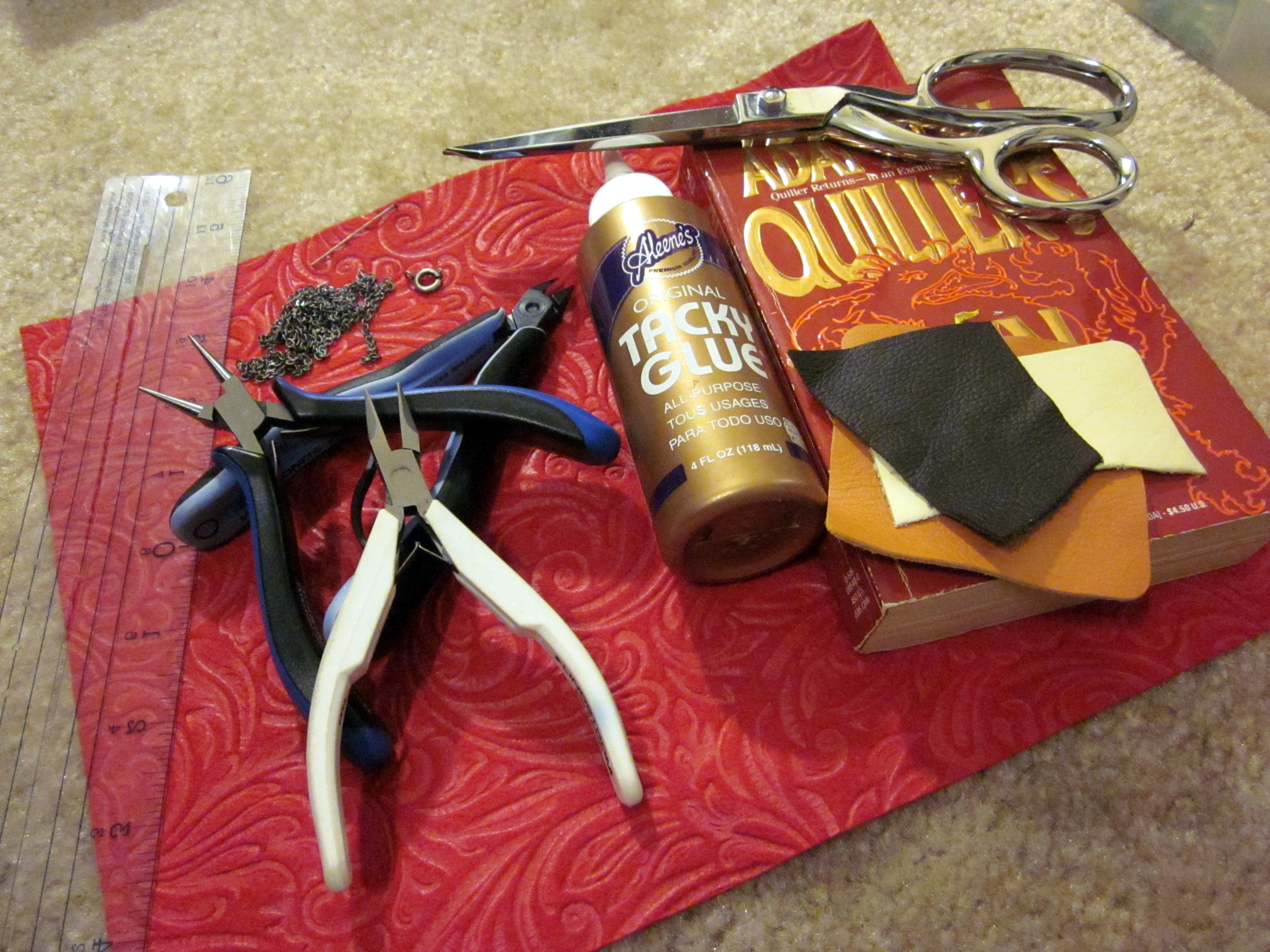 The tutorial suggests using leather from old handbags, but I didn’t have any on hand and the ones from Salvation Army were $4-8. Instead, I bought a bag of leather scraps from Hobby Lobby. I also found red felt that looked like patterned leather.