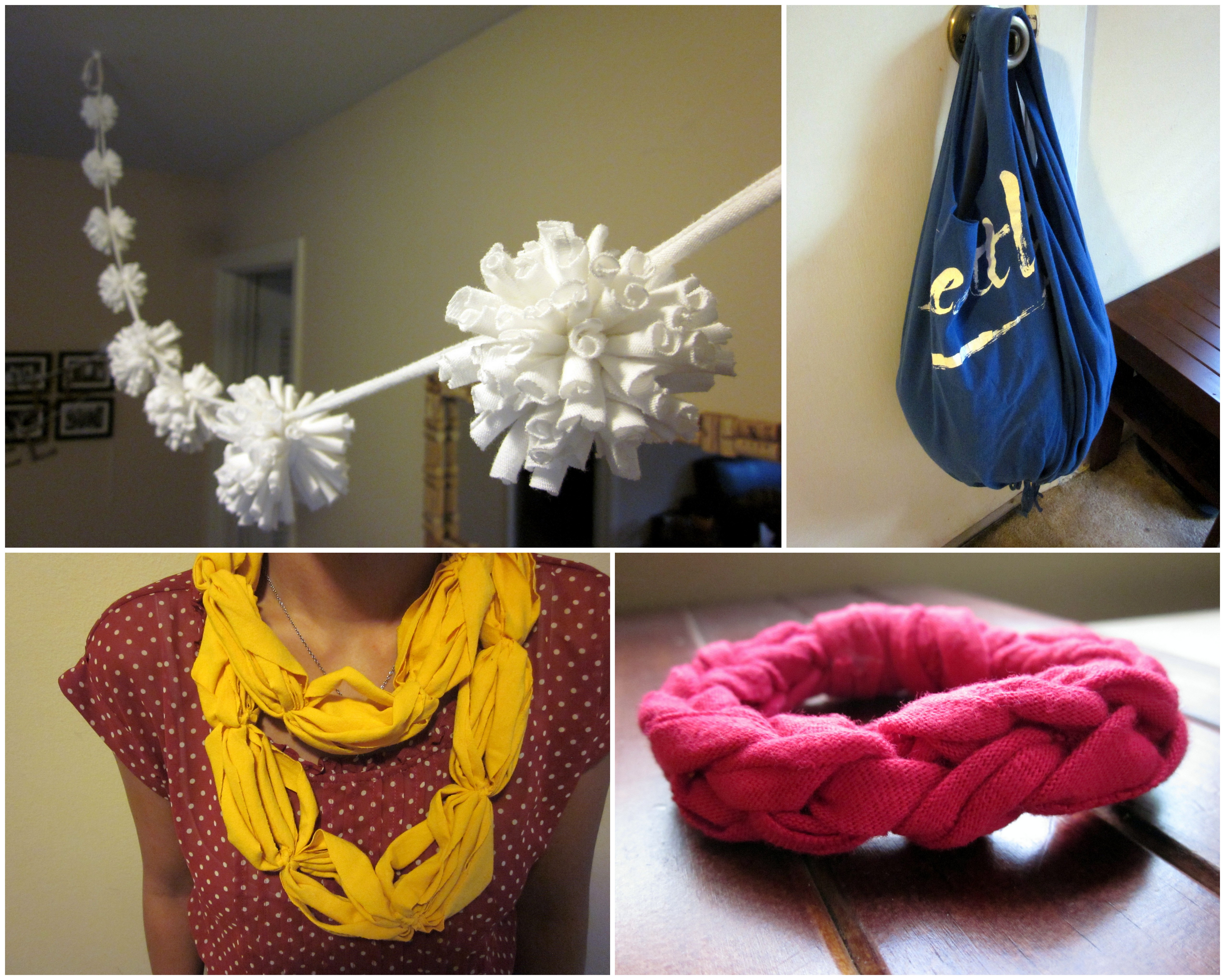 In honor of Earth Day yesterday and in preparation for a brunch/craft party next week, I spent my Sunday making decorations and samples from some of C-Man’s old tees. There are so many possibilities for upcycling/reconstructing old tees, just do a quick search on Pinterest. I hate sewing so I only went with no-sew projects. You can do a lot with just scissors and glue. ;-P
