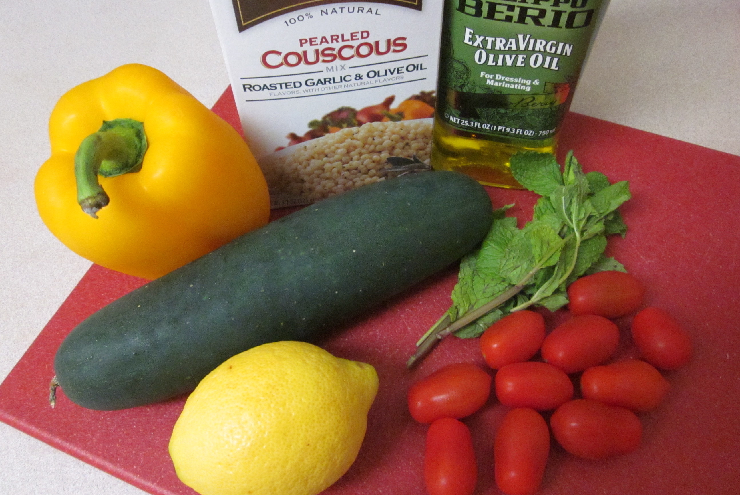 Cook the couscous according to the package instructions. Do not overcook the couscous like I did—it turned out a bit too mushy. Allow the couscous to cool in the refrigerator for at least 30 minutes. While the couscous is cooling, dice the bell pepper, cucumber, tomato, and mint. Gently mix in the veggies with the couscous. Squeeze in half a lemon. Add 2 T olive oil and salt and pepper to taste. Mix well. Refrigerate for another 30 minutes to allow the flavors to marinate.