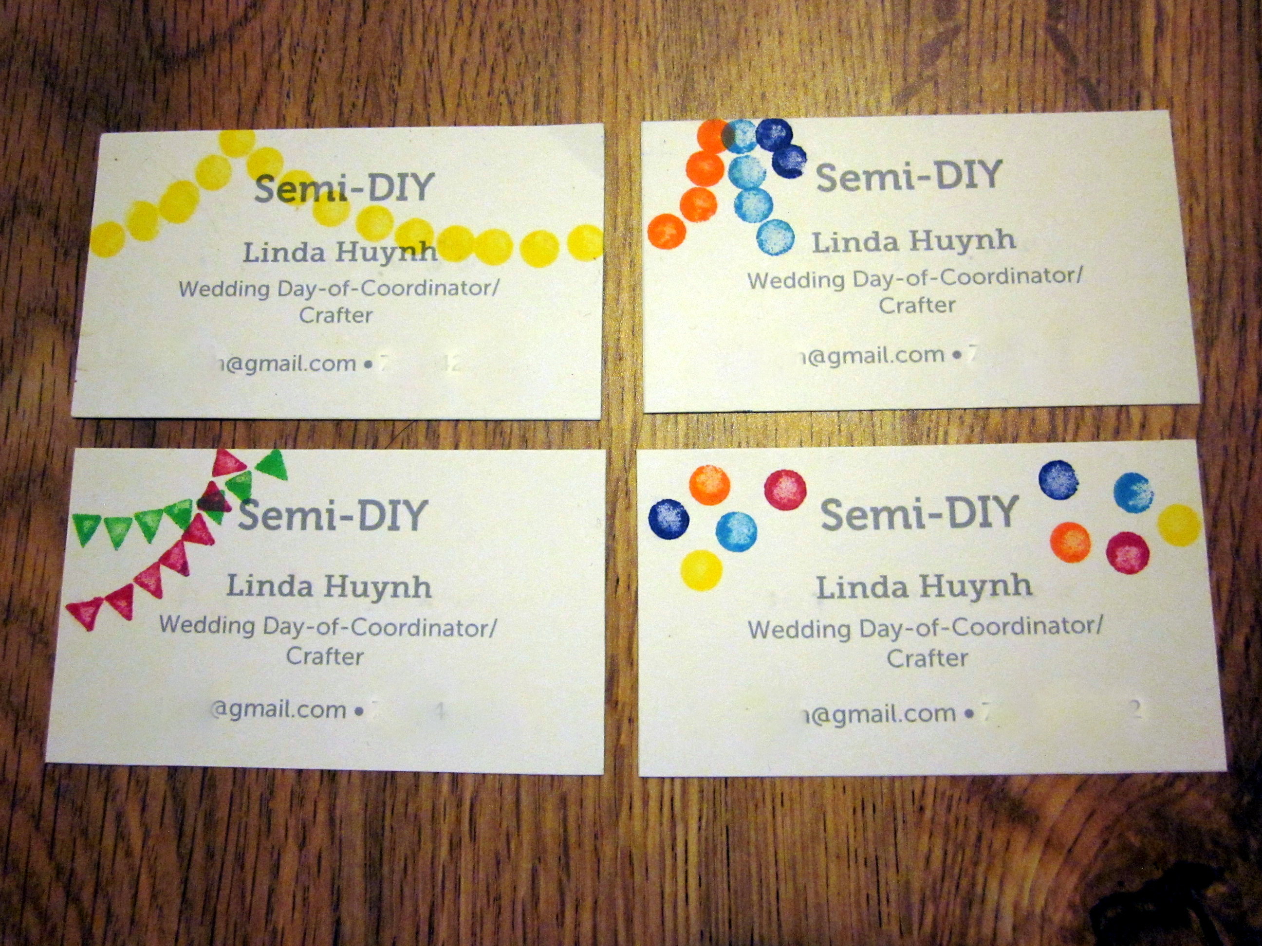Last week I had a networking event to attend—Thursday Therapy—a monthly gathering of wedding professionals for a night of mingling along with yummy food and drinks. I’ve been procrastinating with making business cards because I wanted to design a logo. But I definitely needed to share my info that night. I decided to go with simple DIY business cards using cardstock and eraser stamps.