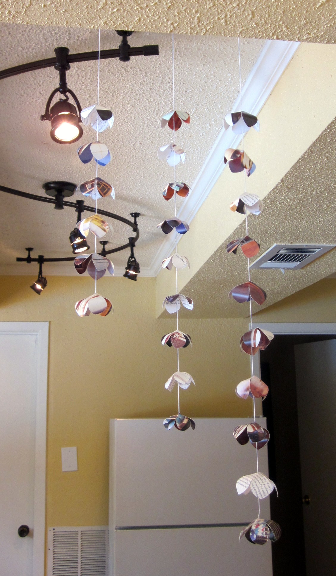 Paper Flower Garland from The Elli Blog – I used my Cricut to cut out the flower templates on pages from a thrifted German wood crafts book. This was a very labor intensive craft with cutting out the flowers, curling the petals, gluing the petals together, stringing the flowers, and then gluing the flowers in place. The flowers with long petals looked imbalanced when glued together so I didn’t use them. I would not do this again unless it had a more lasting use. I hung the garland over the drinks table and on the front door.