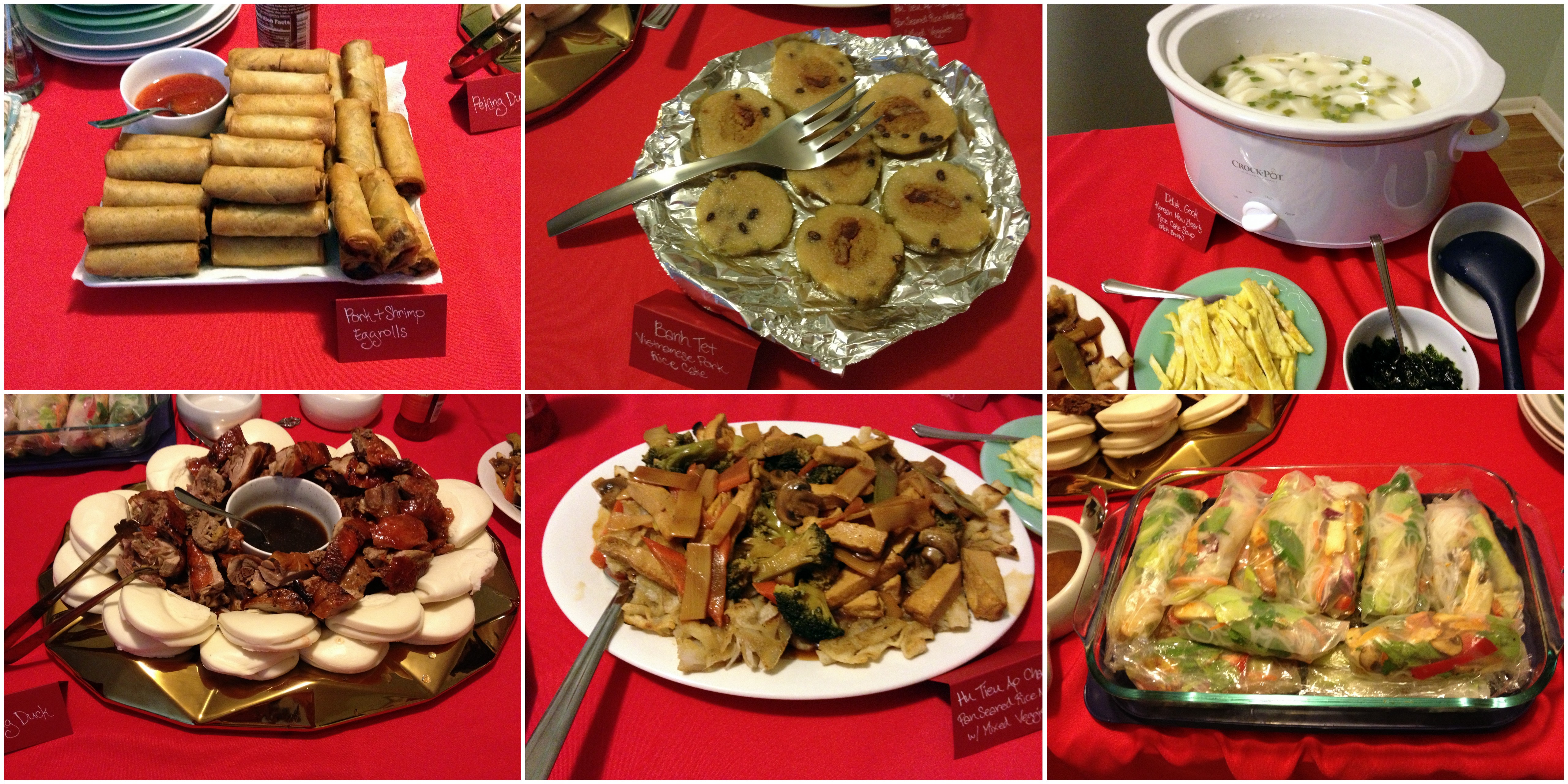 We provided pork and shrimp egg rolls, Vietnamese banh tet (pork rice cake), Korean dduk gook (rice cake soup), Peking duck from Din Ho, and hu tieu ap chao (veggie crispy rice noodles) from TC Noodle House. Our friends brought more alcohol, veggie spring rolls, dumplings, brownies, and cake.