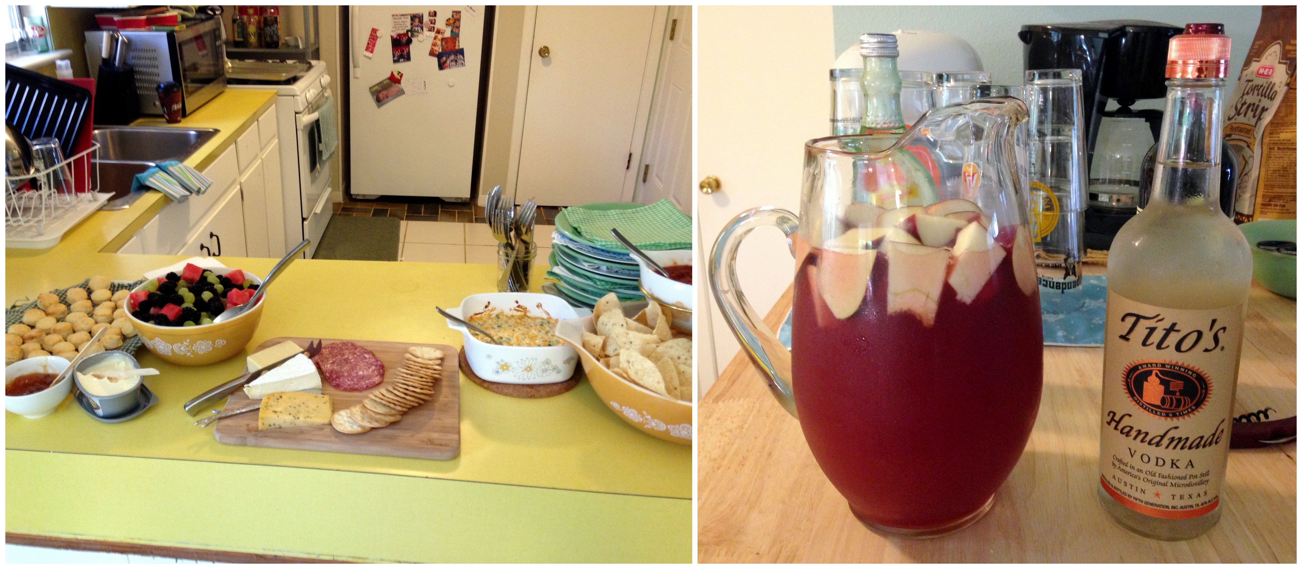 I provided a few snacks and punch and friends contributed more goodies. The Jalapeno Corn Dip from Lovely Little Kitchen was very tasty and I would make it again. I tried making mini biscuits using Window on the Prairie’s recipe, and they turned our well but not drastically more delicious than canned biscuits. The Apple Punch from Passion for Parties with an optional vodka addition was just ok.